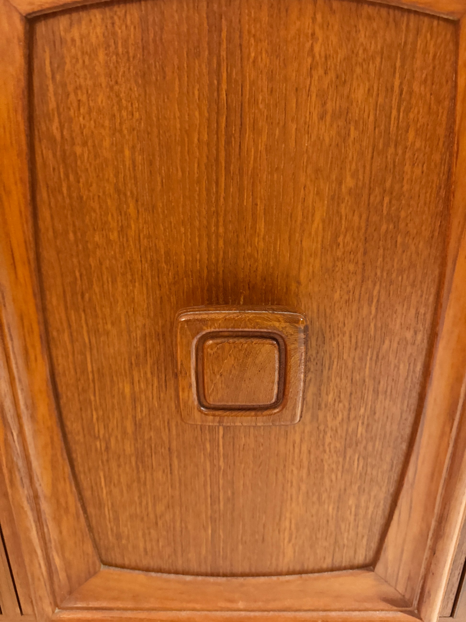 A beautifully proportioned mid-century dresser by Burgess, featuring the brand’s signature sculptural details and warm timber tones. With six deep drawers flanking a central cupboard, this piece offers generous storage while showcasing the bold geometric forms that define Australian mid-century bedroom design.
