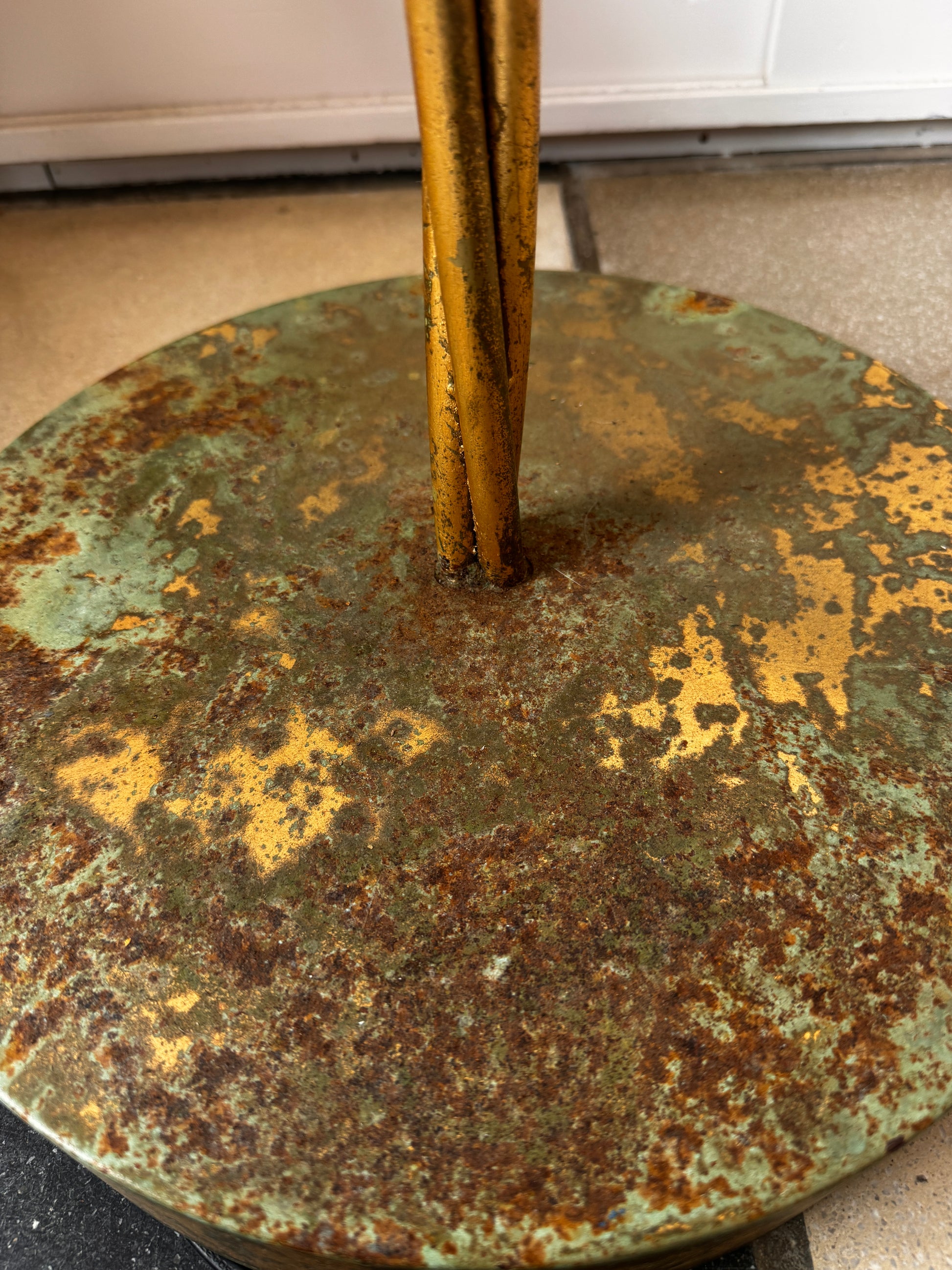 What truly sets this piece apart is its extraordinary aged patina. The base has developed a rich mix of gilt tones, oxidised brass and verdigris hues over time — an authentic surface that tells the story of the lamp’s age and gives it incredible depth and character. Rather than hiding it, the patina becomes part of the lamp’s sculptural presence.