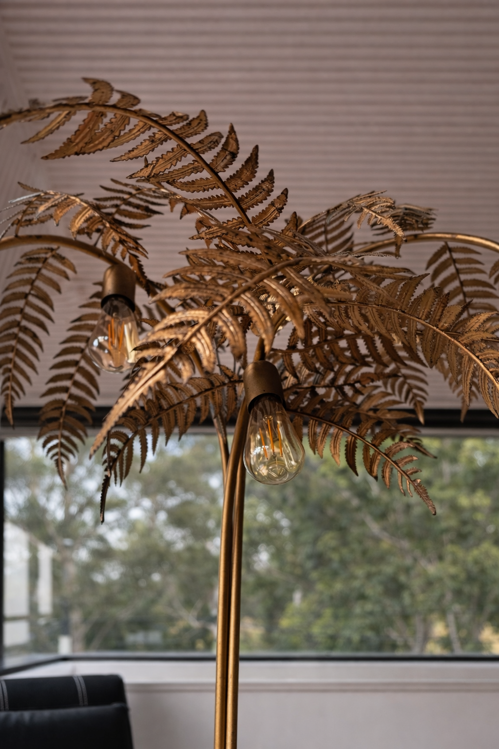 Three bulbs sit beneath the palm leaves, creating a warm layered glow that highlights the intricate metalwork and casts beautiful botanical shadows across the room when lit, providing a spectacular atmospheric outline