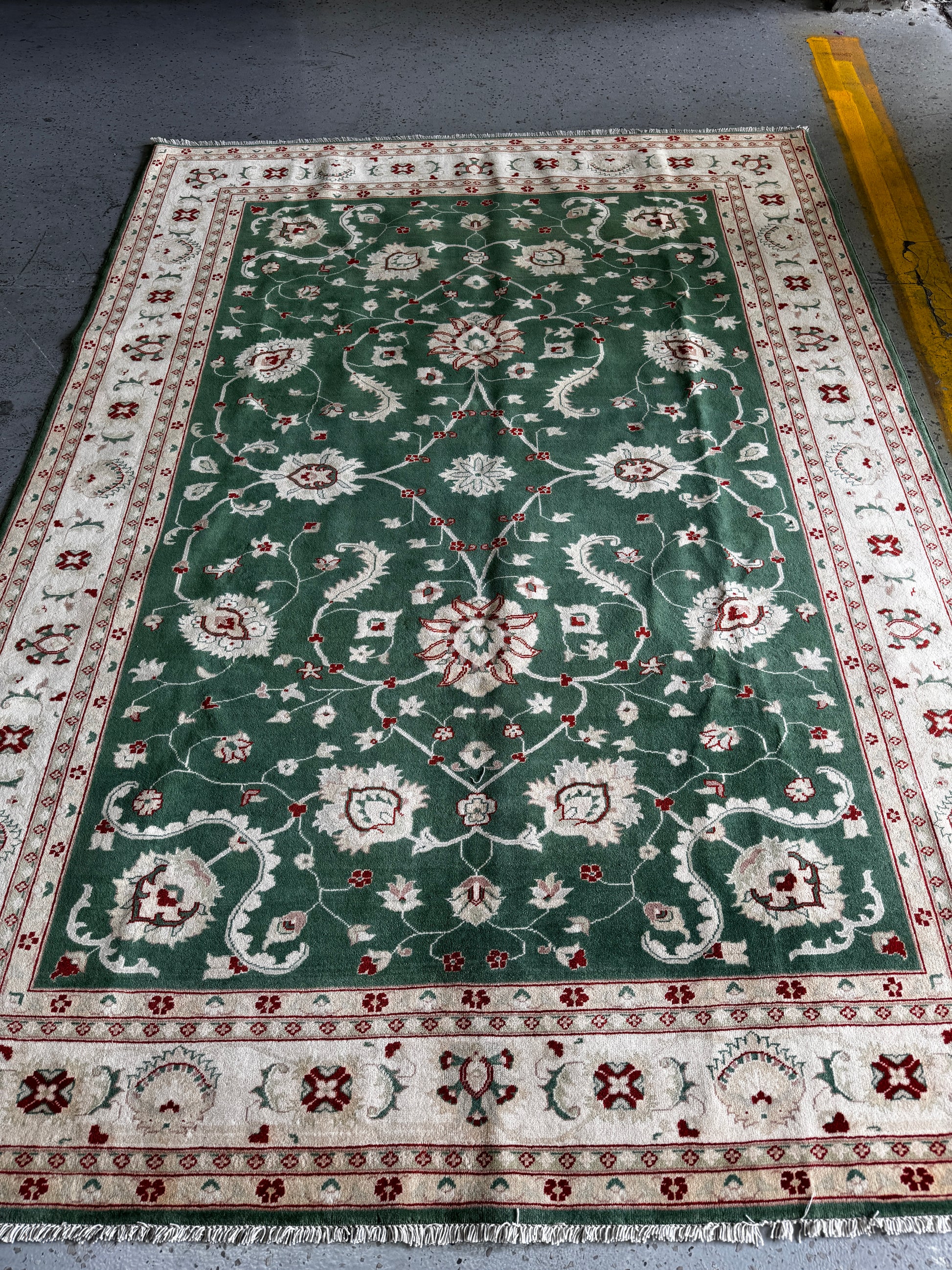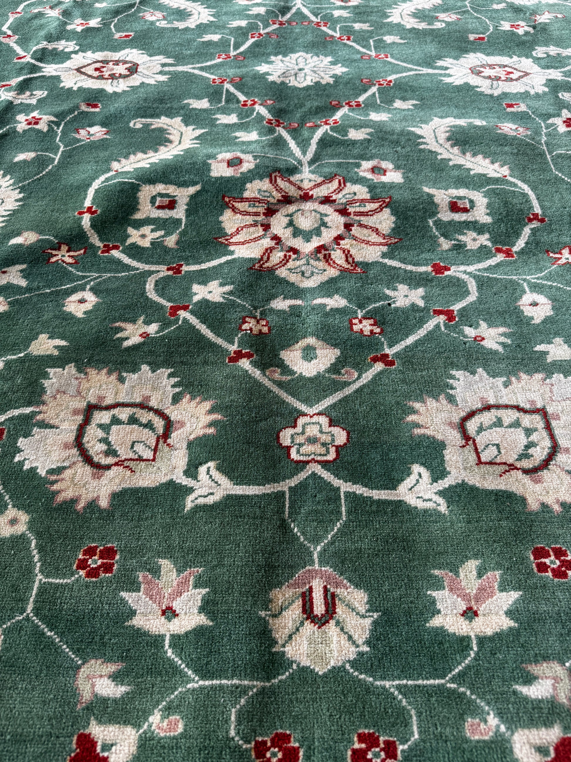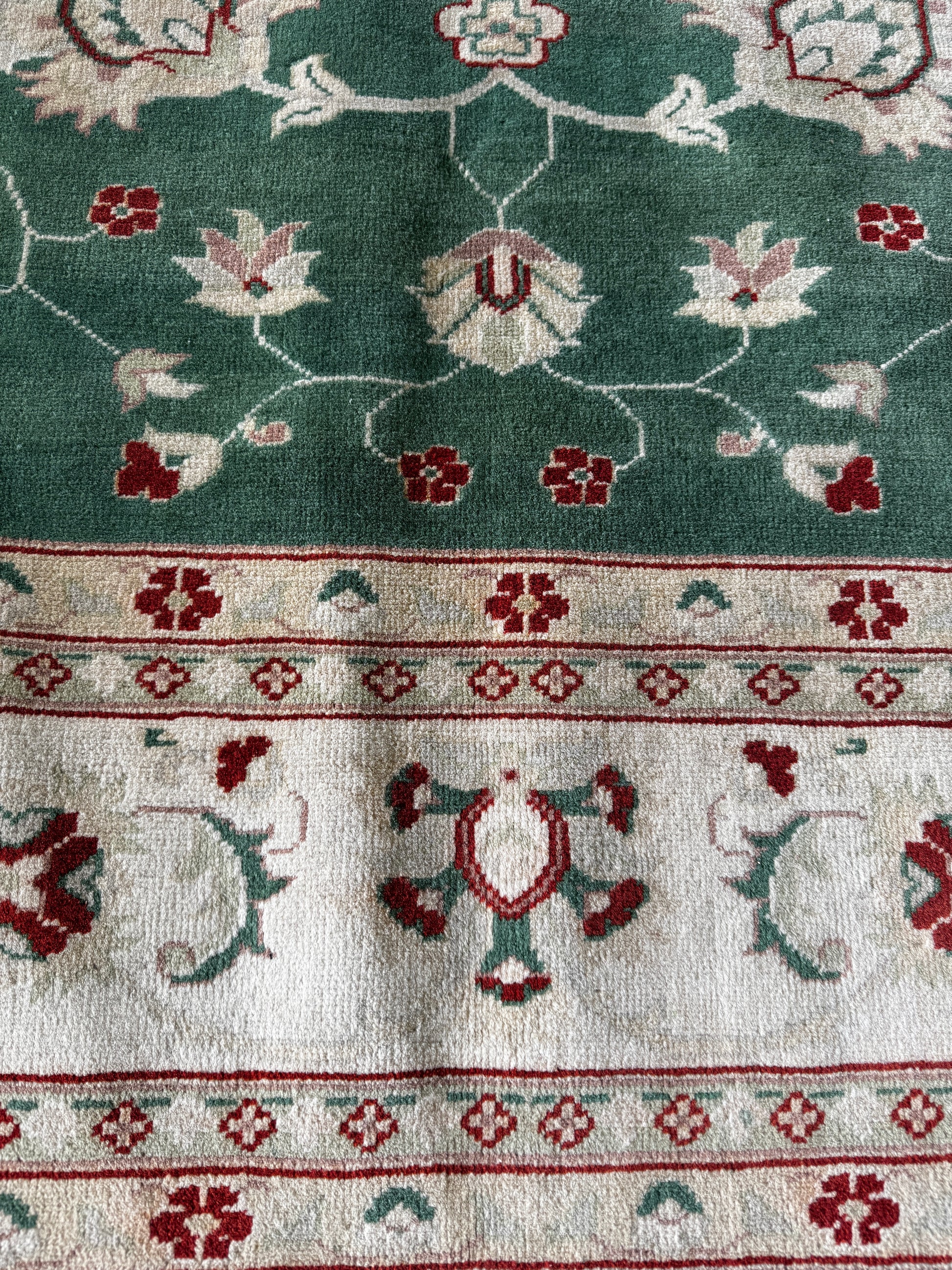 The palette combines soft forest-green and ivory with accents of garnet red and sage — a timeless and quite rare combination that feels both grounded and refined. The design features flowing palmettes and vine scrolls framed by a wide border, reflecting classic Persian Ziegler influence interpreted through Afghan artistry.