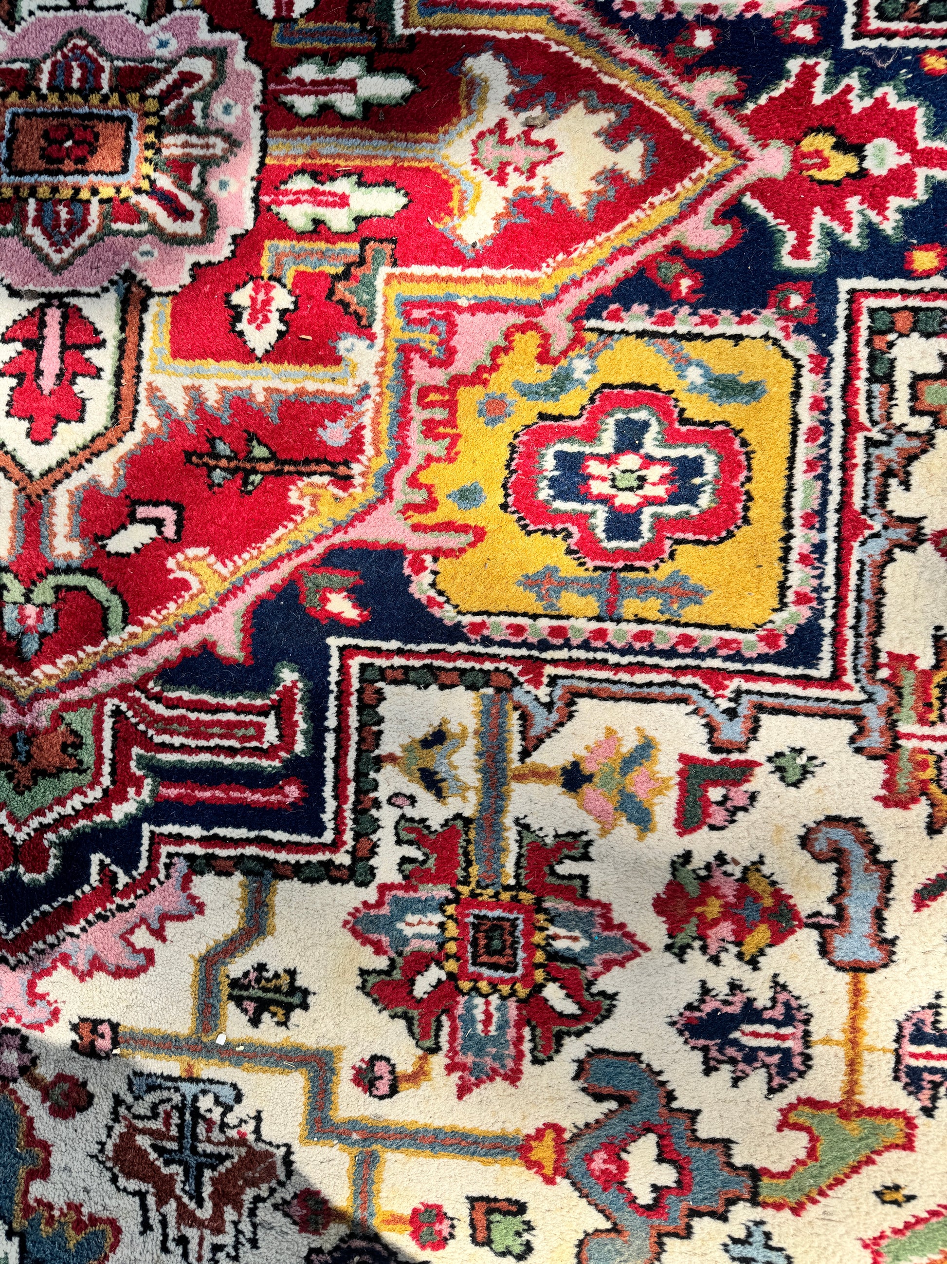 This rug’s graphic strength and bold colours make it a statement piece, perfect for anchoring a living space, dining area, or entryway. It combines the timeless appeal of Heriz design with Indian craftsmanship.