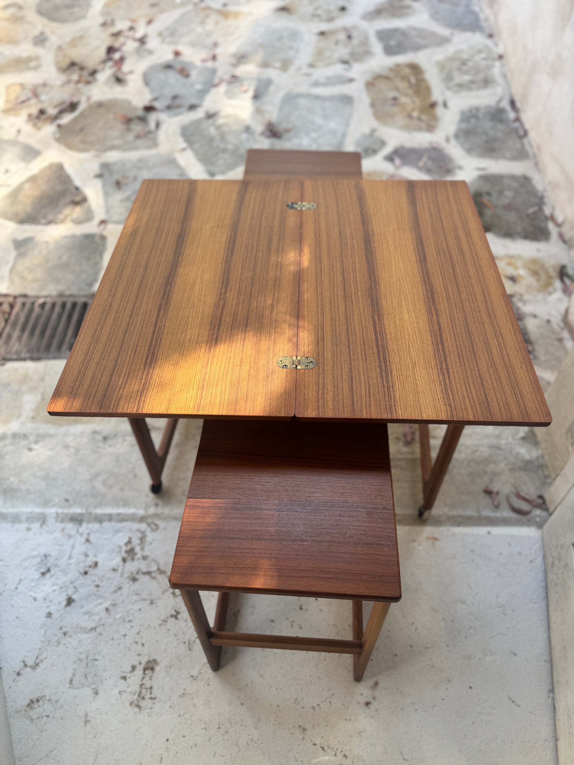 This elegant set comprises one central table that opens up to reveal a larger and useful table surface. The two stools hang neatly beneath the table and slide out for use as seating on rather side of the table or as additional tables. All pieces fold away creating a streamlined profile when not in use. Crafted in rich, warm teak with McIntosh’s signature clean lines and fine joinery, the design reflects the influence of Danish modernism while maintaining a distinct British character.