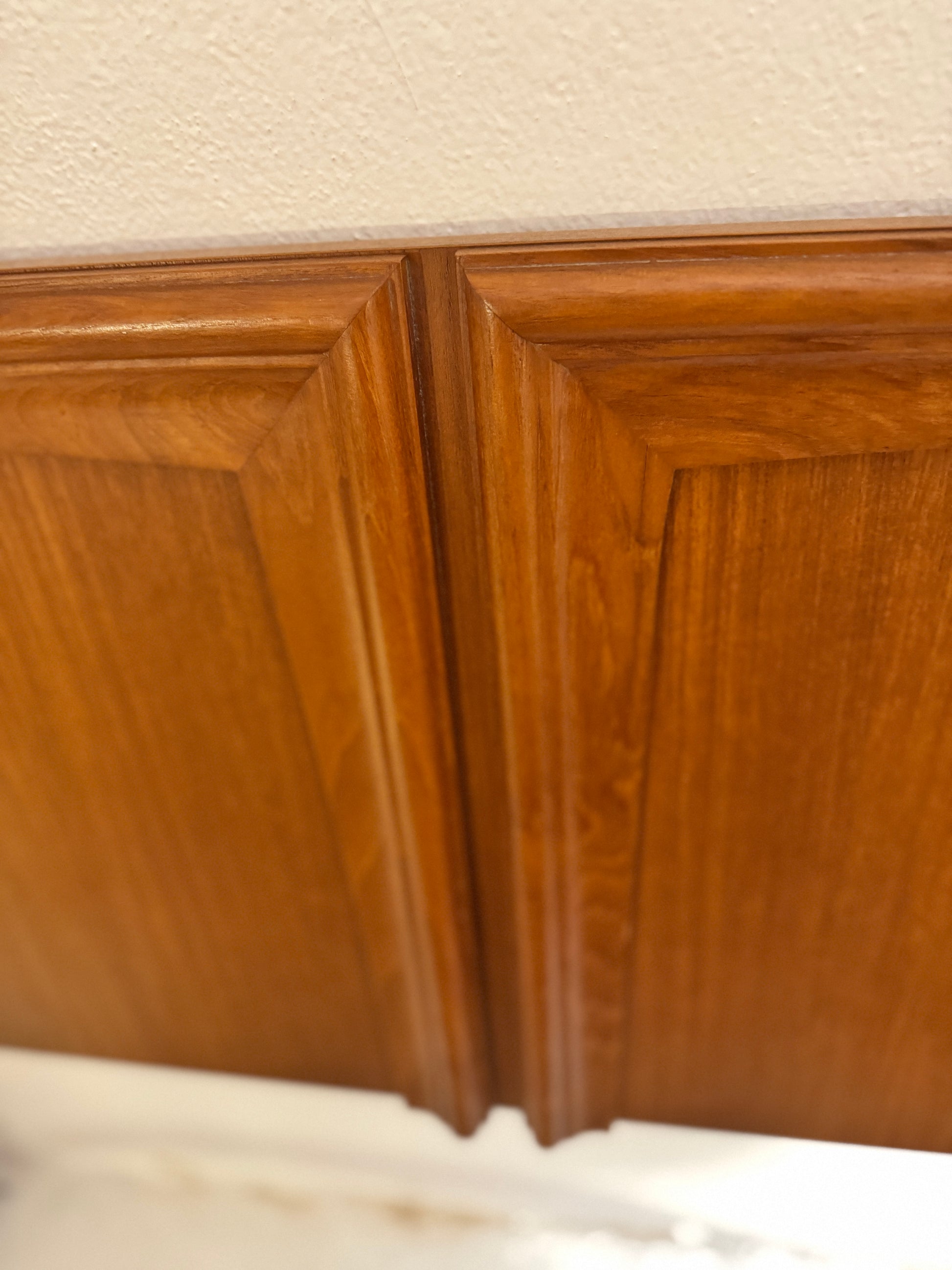 The twin-panelled form features subtle bevelled edges and recessed framed panels, creating depth and warmth while maintaining clean, modernist lines. Its honey-toned timber grain has been beautifully preserved, bringing a natural glow and timeless appeal.