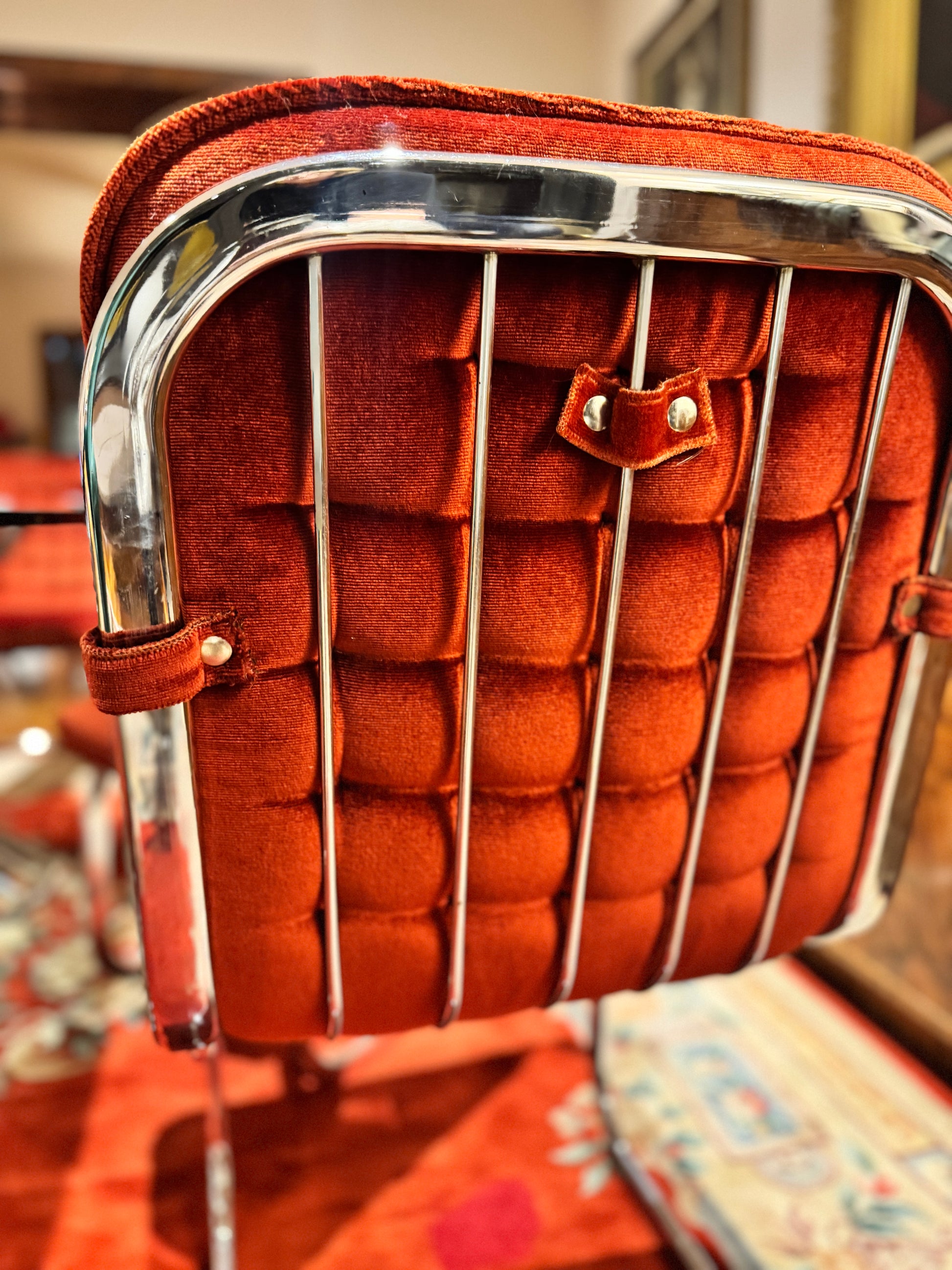 A superb set of six Australian-made cantilever chairs by Namco. With tubular chrome frames and richly upholstered button-back seats in a deep crimson velvet, these chairs capture the glamour of 1970s modernist dining.