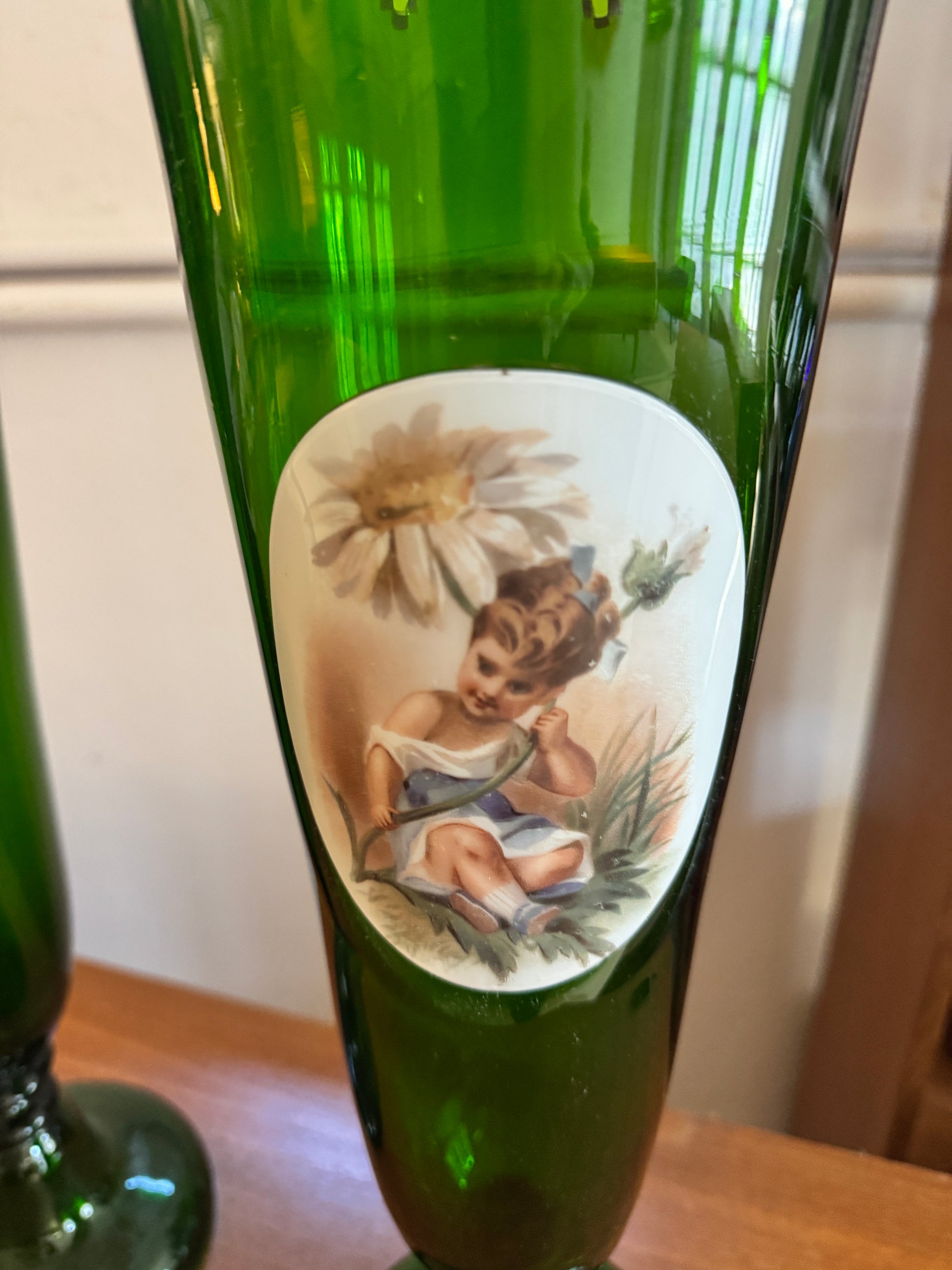 • Hand-applied medallions adorn the front of each vase, depicting romantic allegorical scenes of cherubic children surrounded by flowers, executed with delicate detail and soft colour.