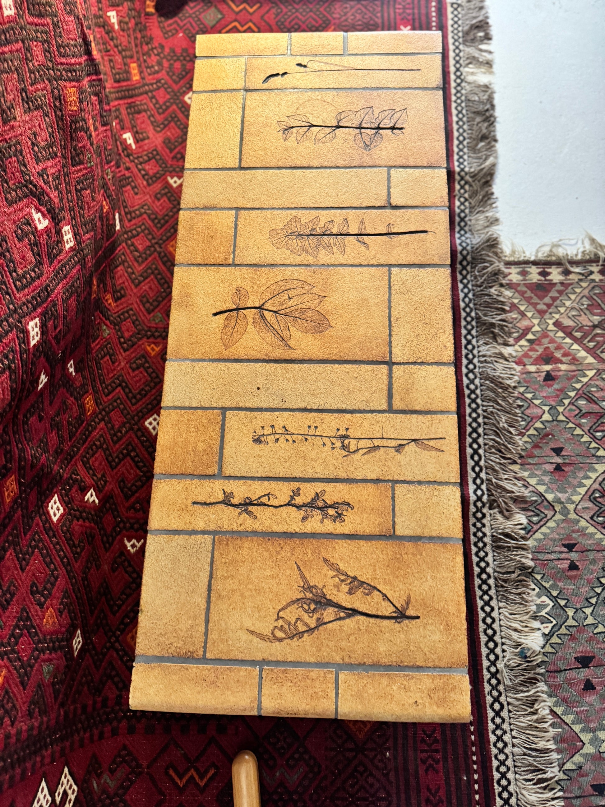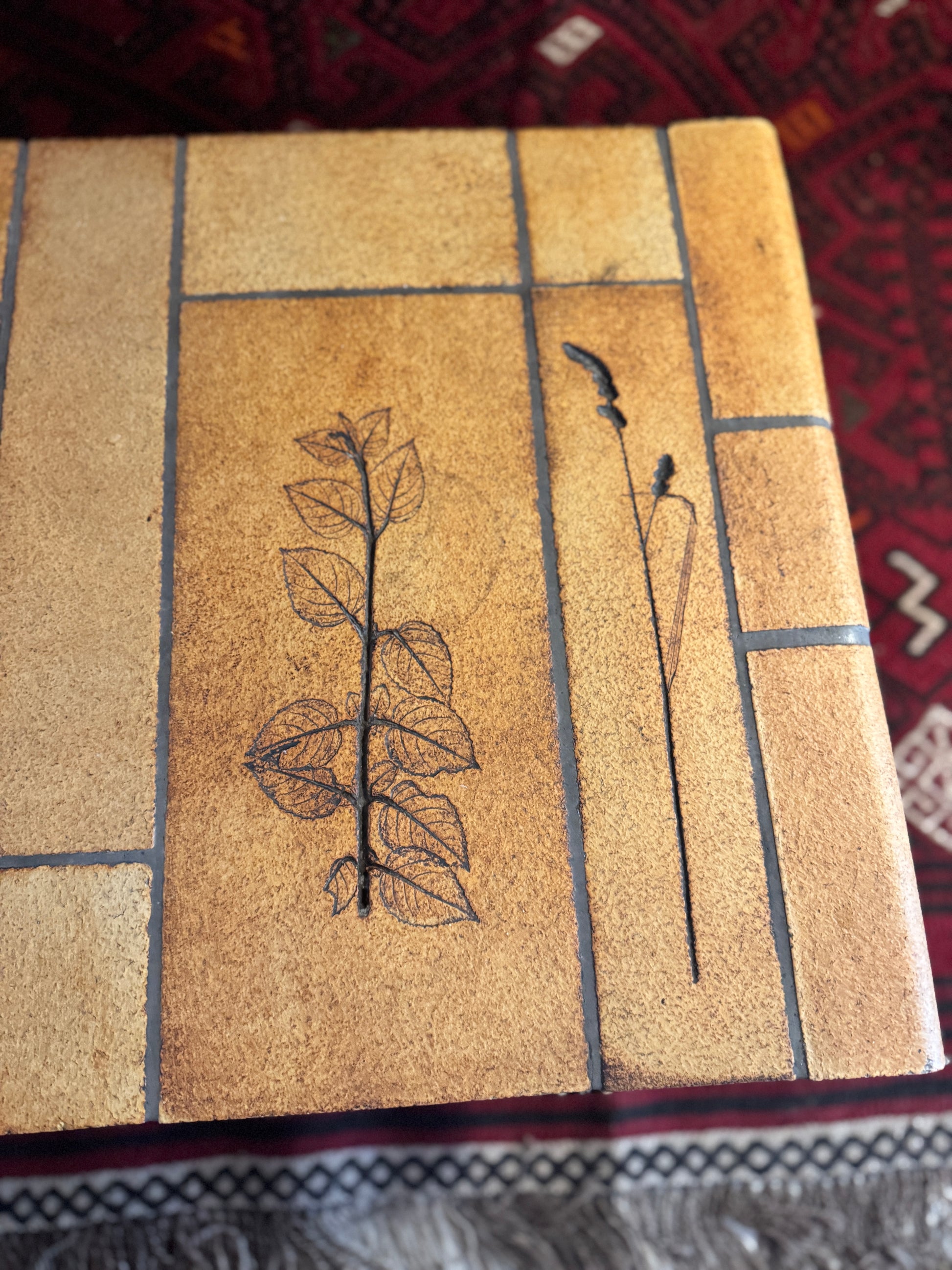The tiled surface features warm terracotta tones decorated with Capron’s iconic botanical imprints — each tile pressed with natural leaves to create a delicate fossil-like impression. Set within a clean rectangular form, the low height makes this an ideal centrepiece for a lounge, allowing the surface artwork to be admired from every angle.