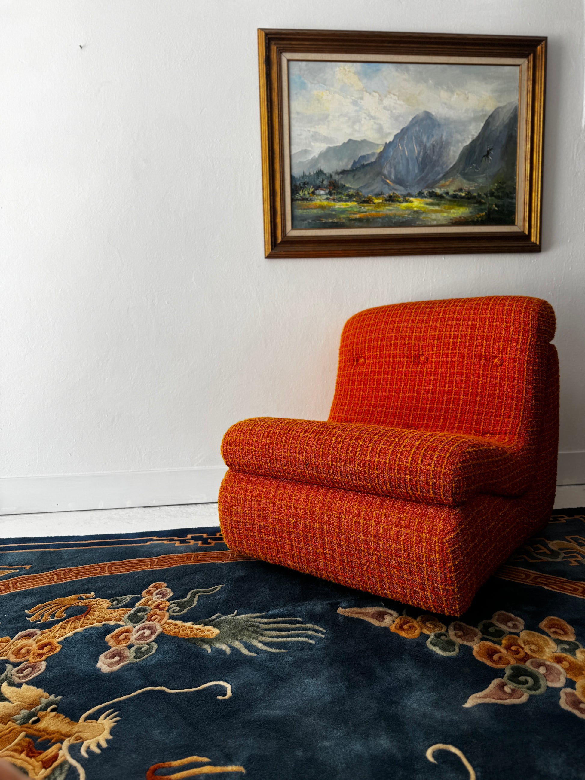 Upholstered in its original textured orange fabric, the colour and weave are unmistakably 1970s ā warm, earthy and full of character. The upholstery presents extremely well, with even wear and a wonderful depth of tone that has only improved with age.