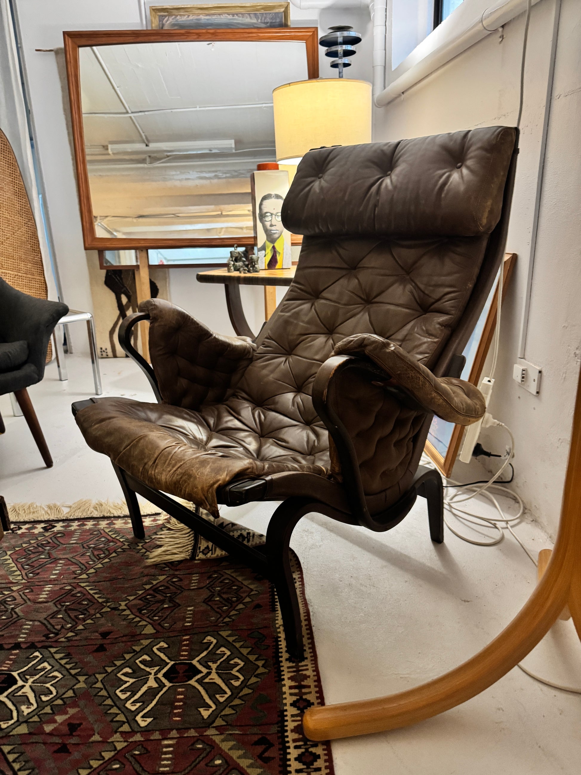 A masterclass in ergonomic design, the chair’s flowing bentwood frame is paired with original deep chocolate buttoned leather, generously cushioned from headrest to armrest. Mathsson’s design was guided by the natural curve of the human body—resulting in a piece that is as comfortable as it is striking.