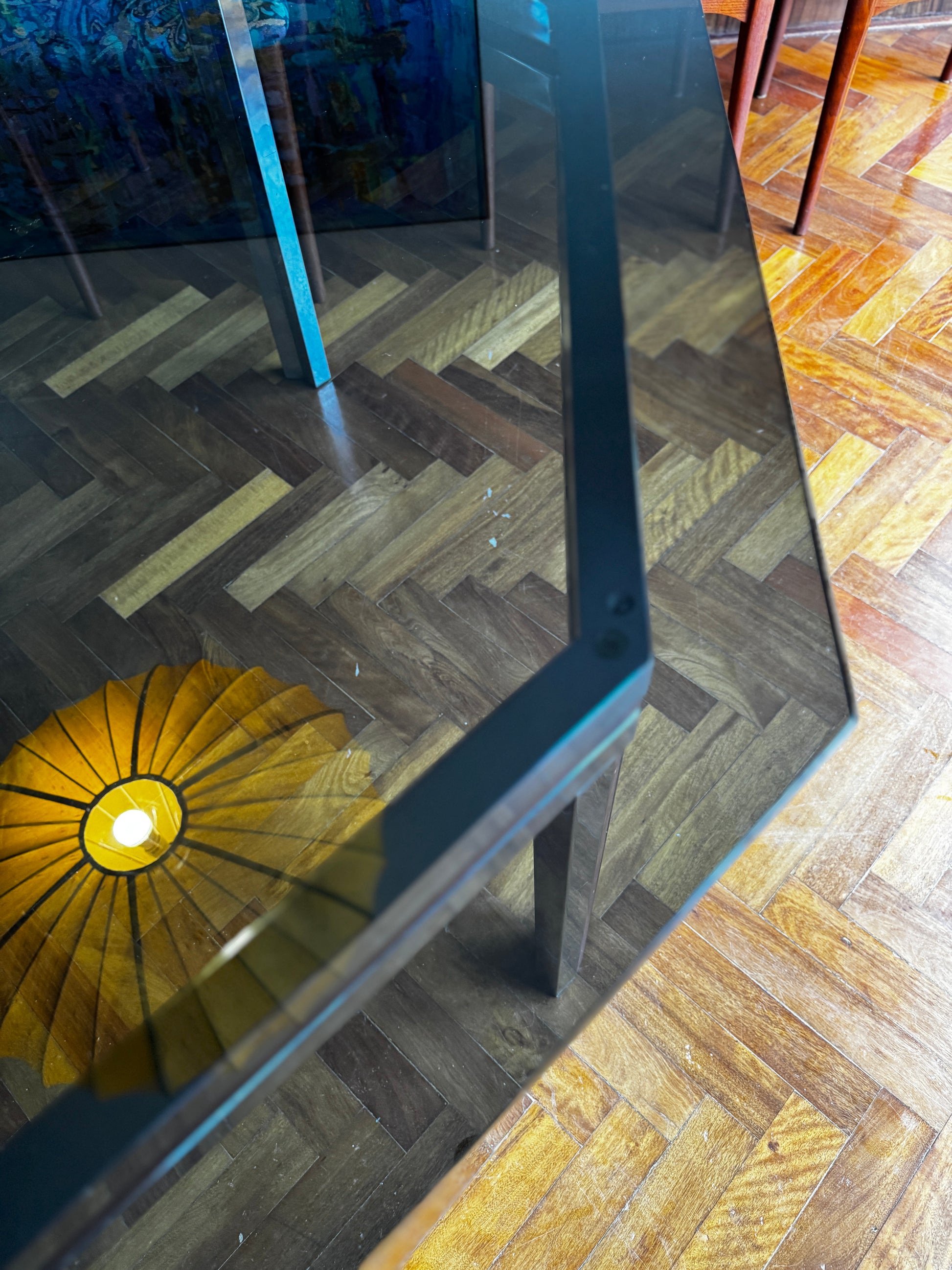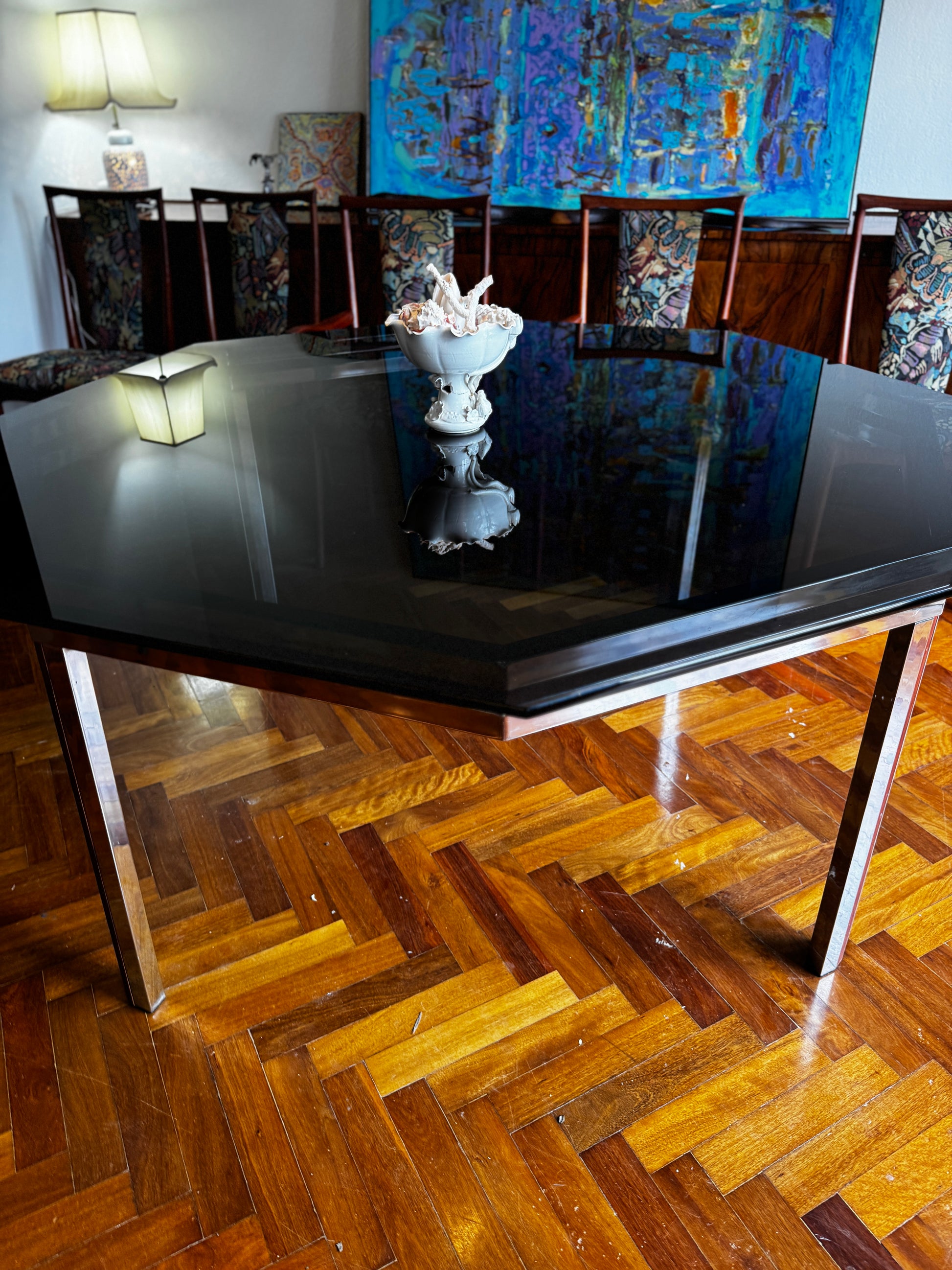 This striking piece features a hexagonal smoked-glass top that floats elegantly above a chrome-plated base, detailed with solid teak inlay running the full length of each leg and apron. The interplay of chrome and timber gives the table a refined, architectural presence—warmth and precision in perfect balance.