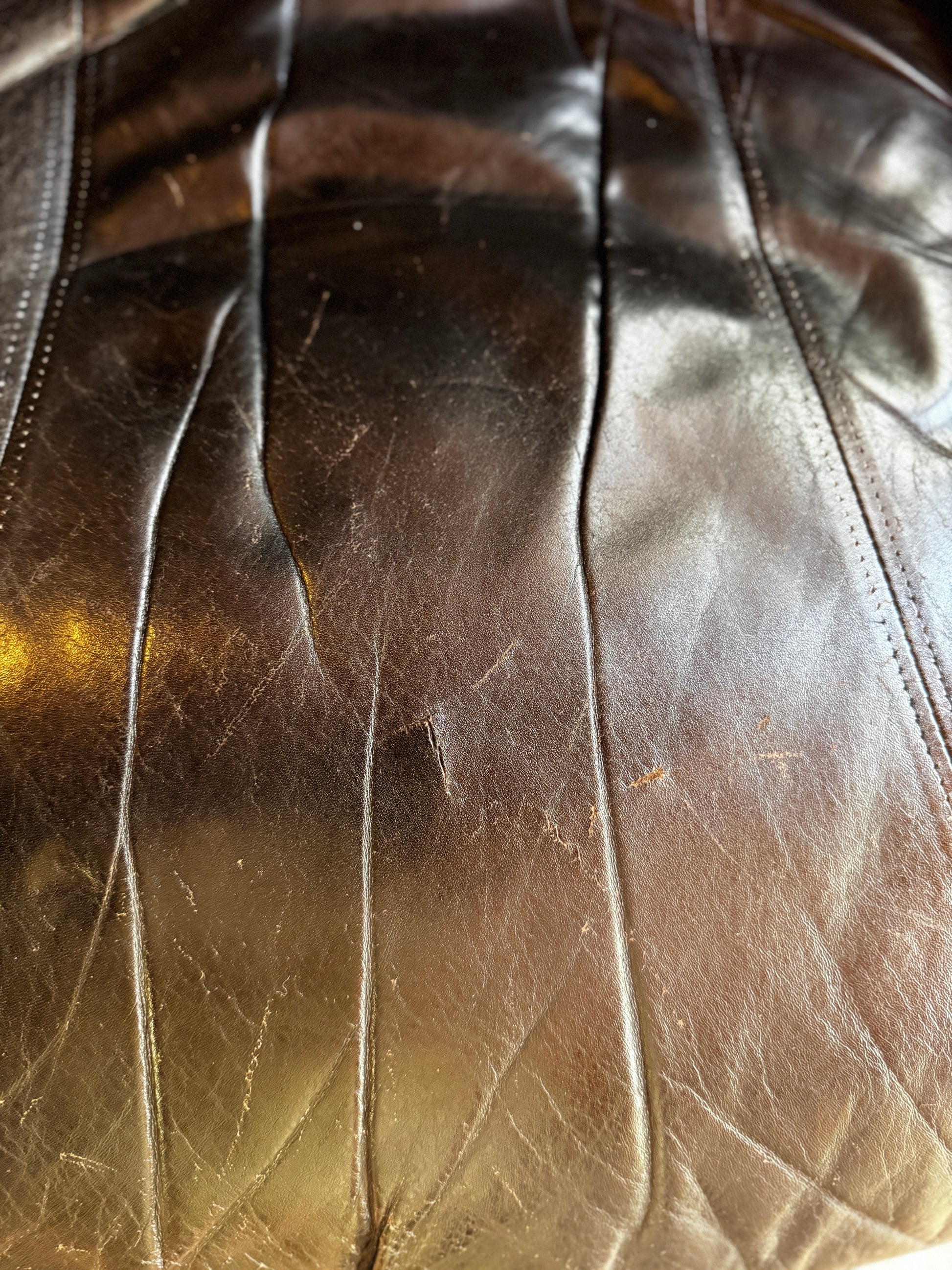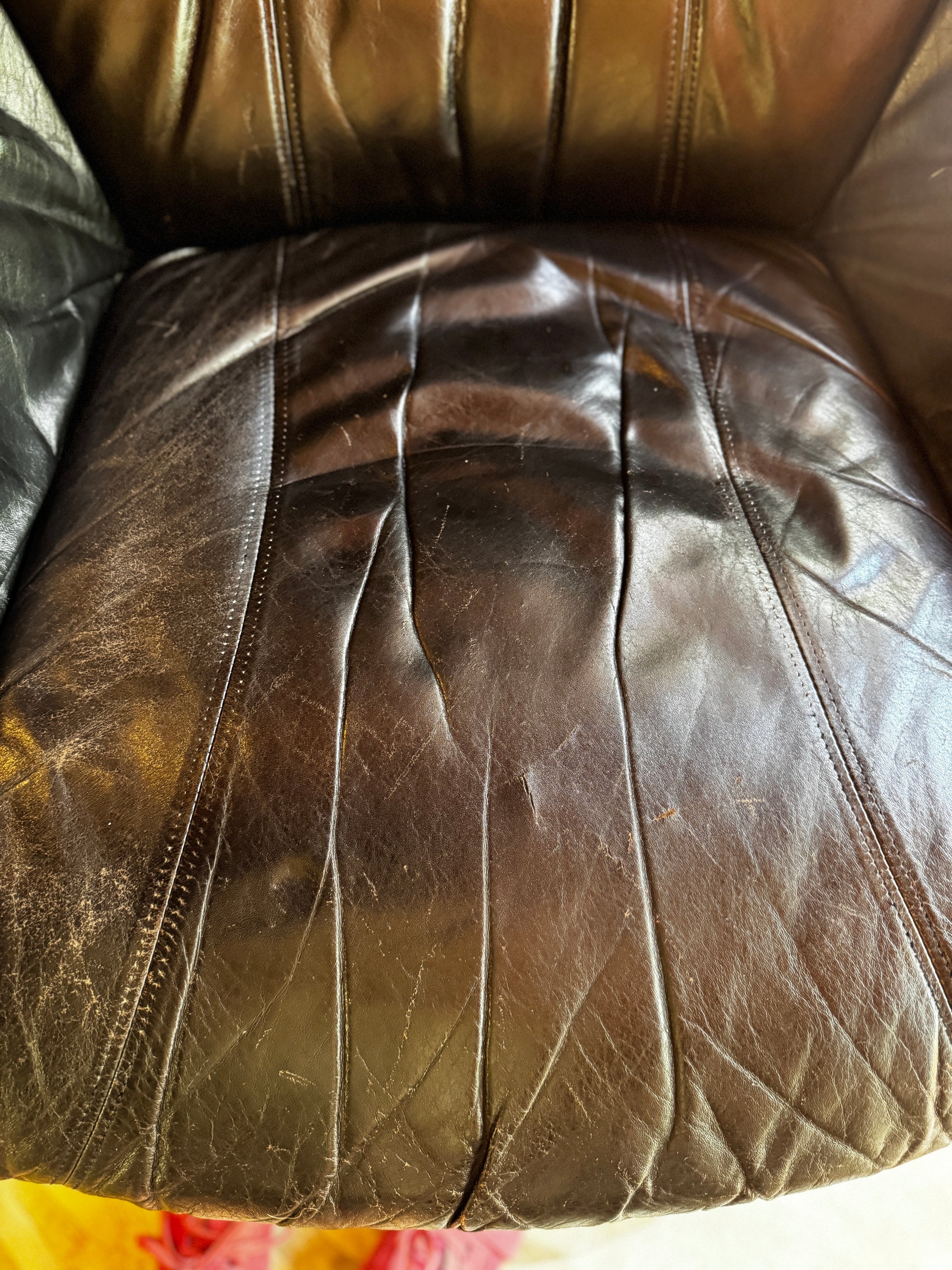 Original leather with attractive creasing and minor age-related wear consistent with use. Frames and swivel mechanisms in excellent working order. Small repair to leather seat on one chair