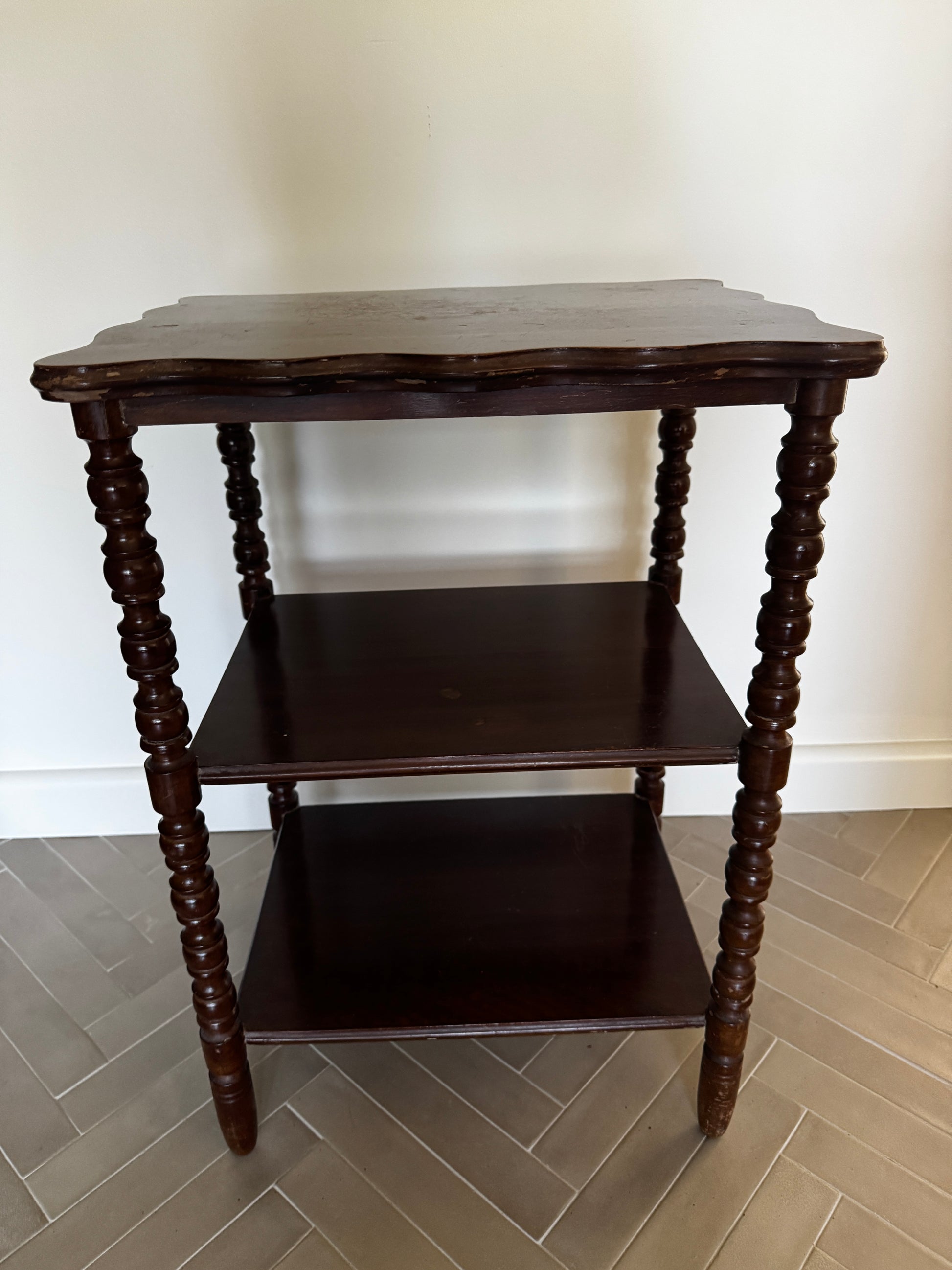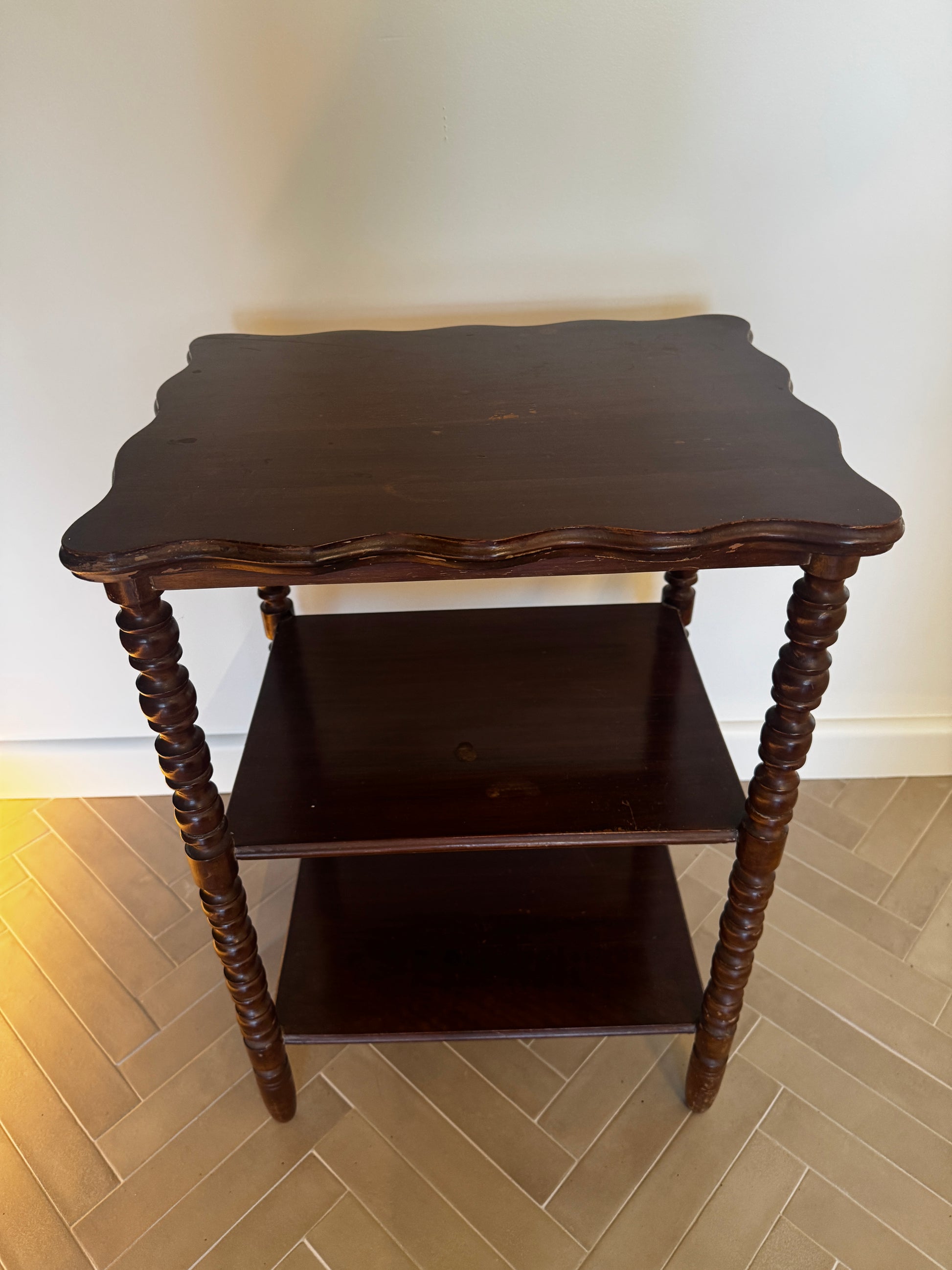 Sweet, sturdy vintage whatnot made from what appears to be solid mahogany, featuring classic bobbin-turned legs and a charming wave-profile top. A versatile size that works beautifully as a bedside table, plant stand, bathroom shelf, or tucked beside a favourite armchair.