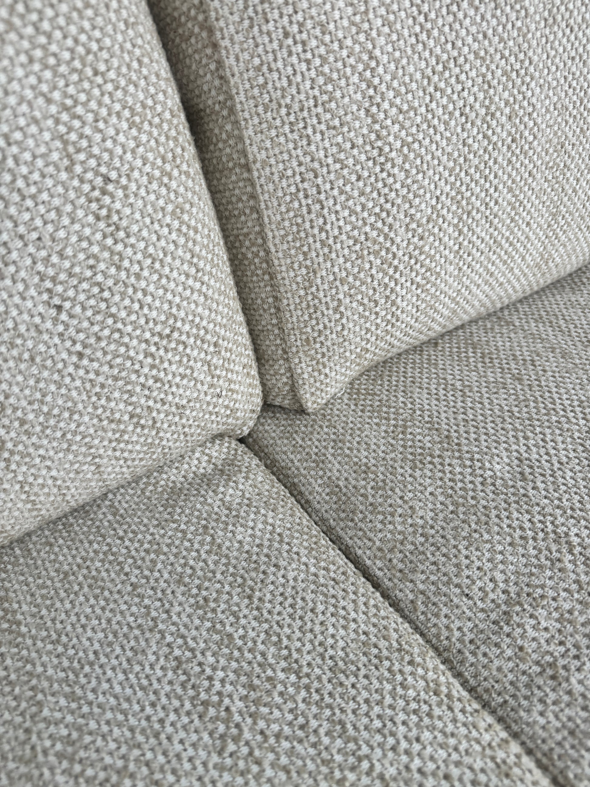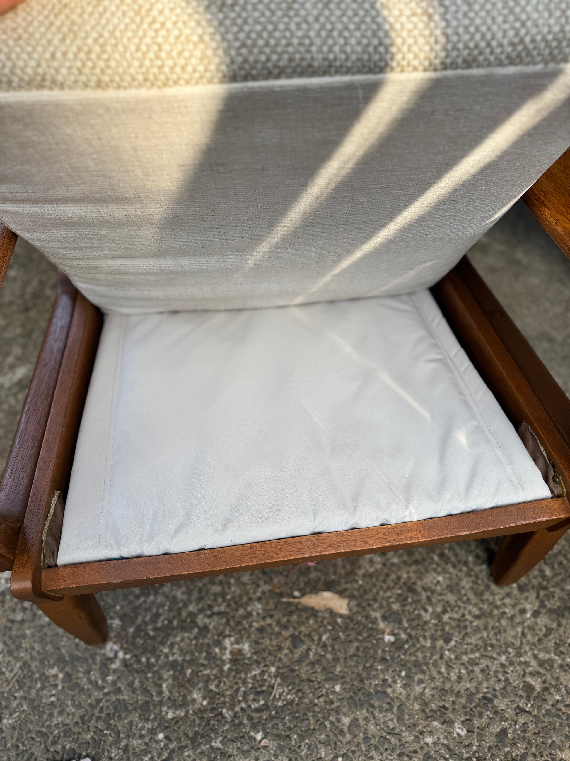 - Upholstery: Professionally reupholstered in a textured neutral fabric, chosen to complement the original design